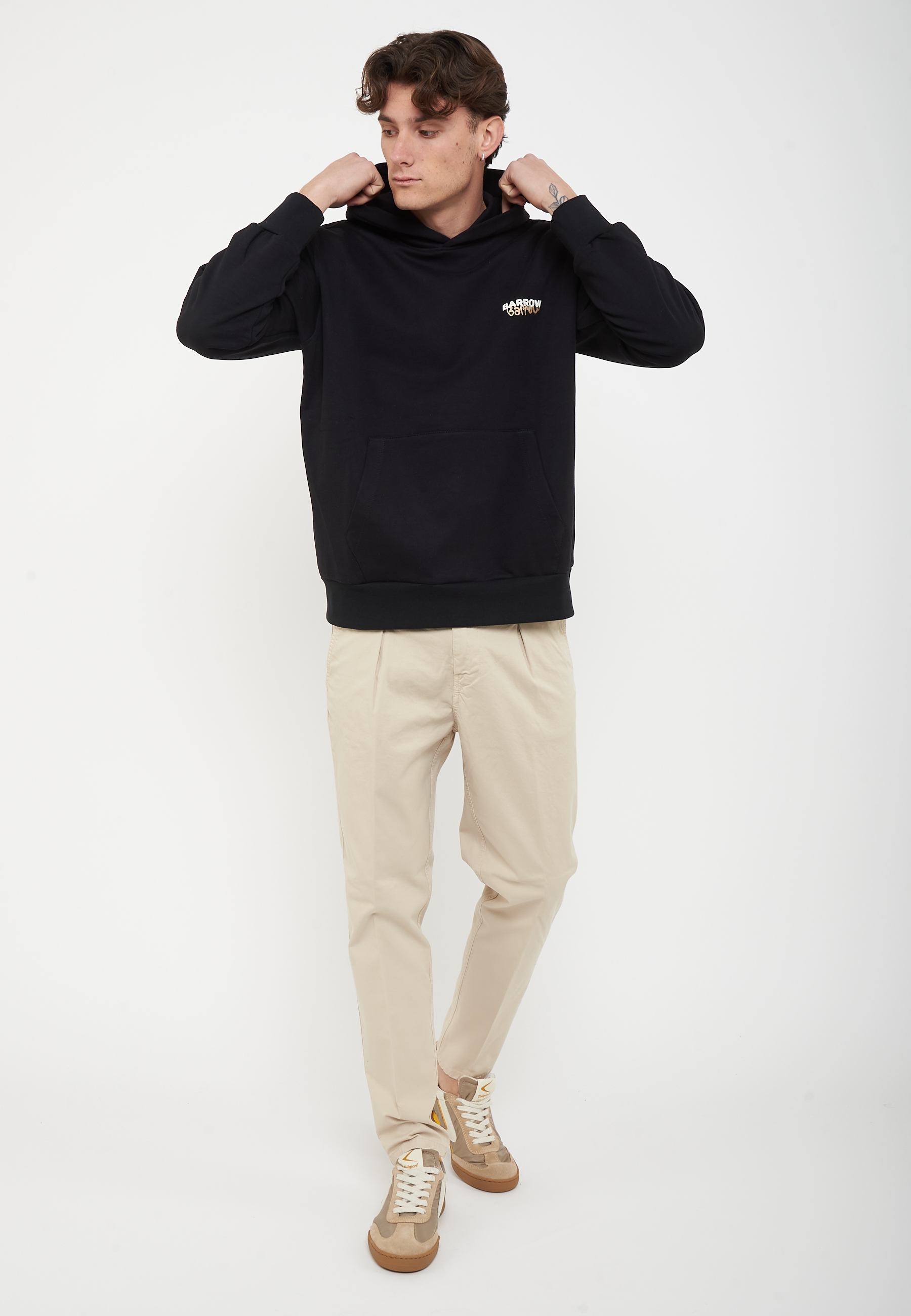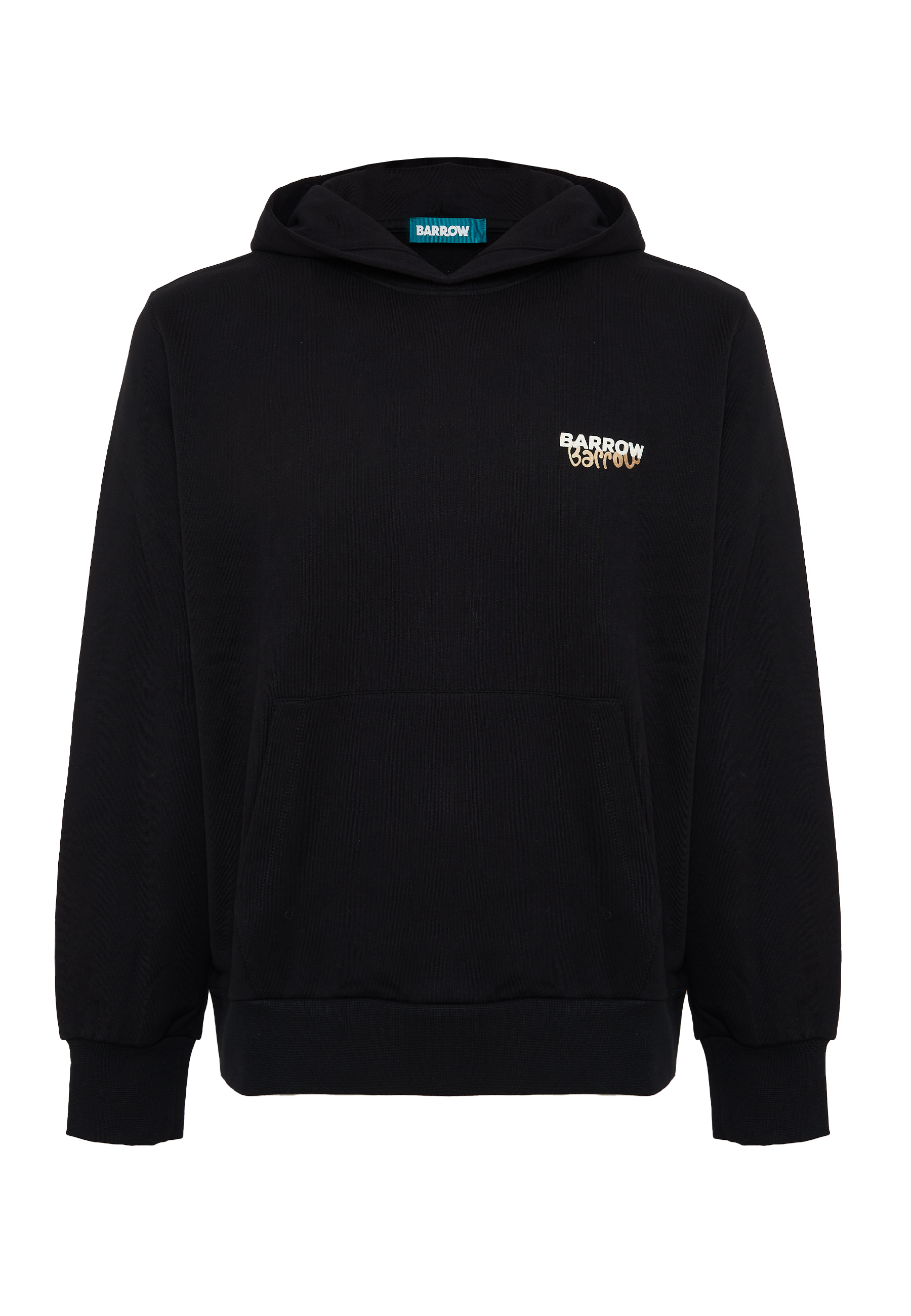 Felpa con cappuccio in 100% cotone dalla vestibilità regolare. Modello con cappuccio e tasca a marsupio, caratterizzato da una grafica sul retro. Logo Barrow applicato sul petto. Polsini e fondo a costine completano il design, per un look streetwear deciso e contemporaneo.