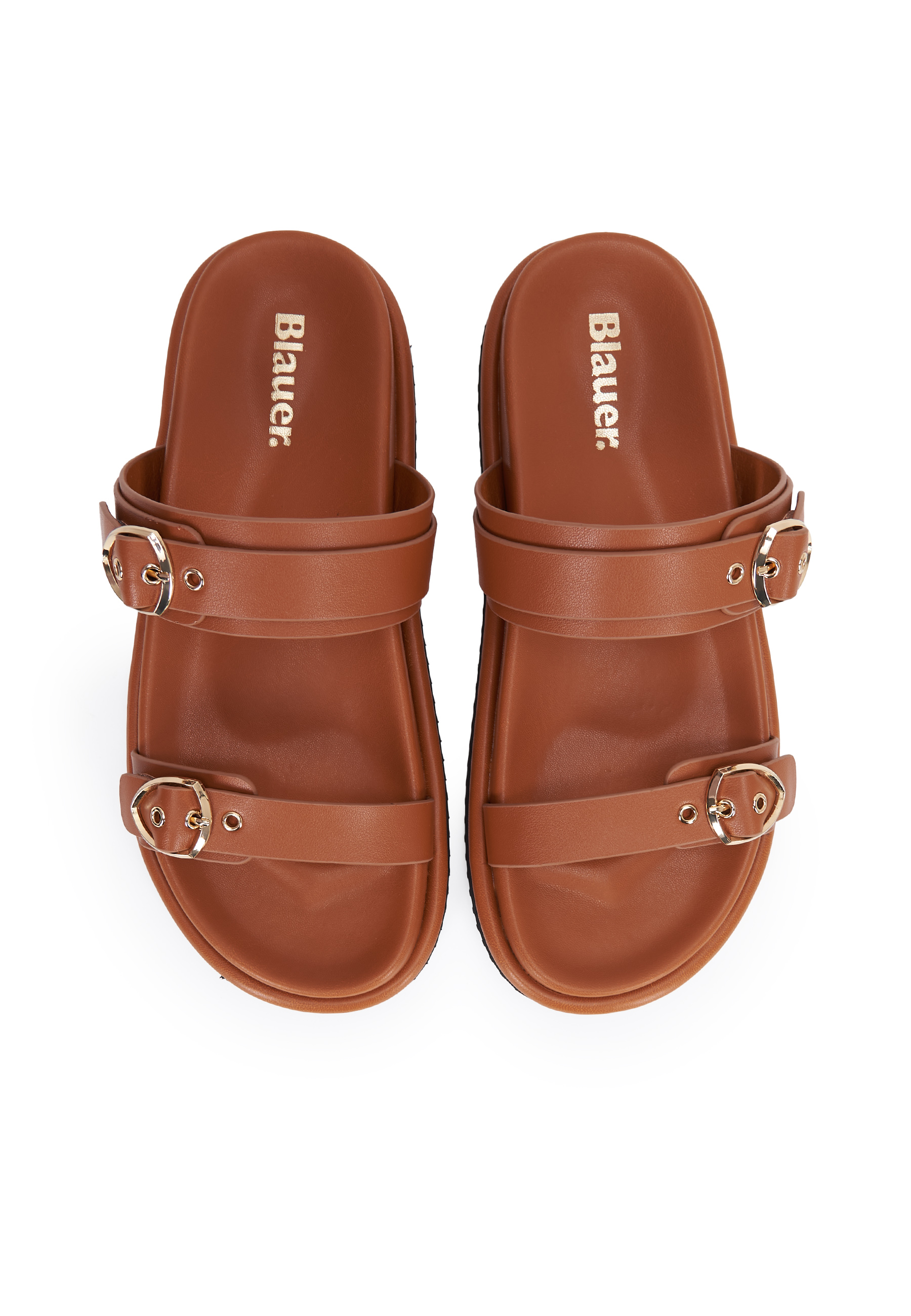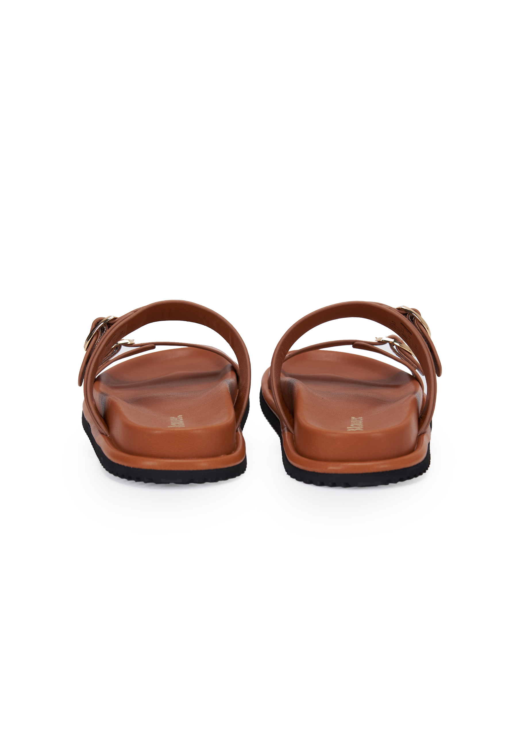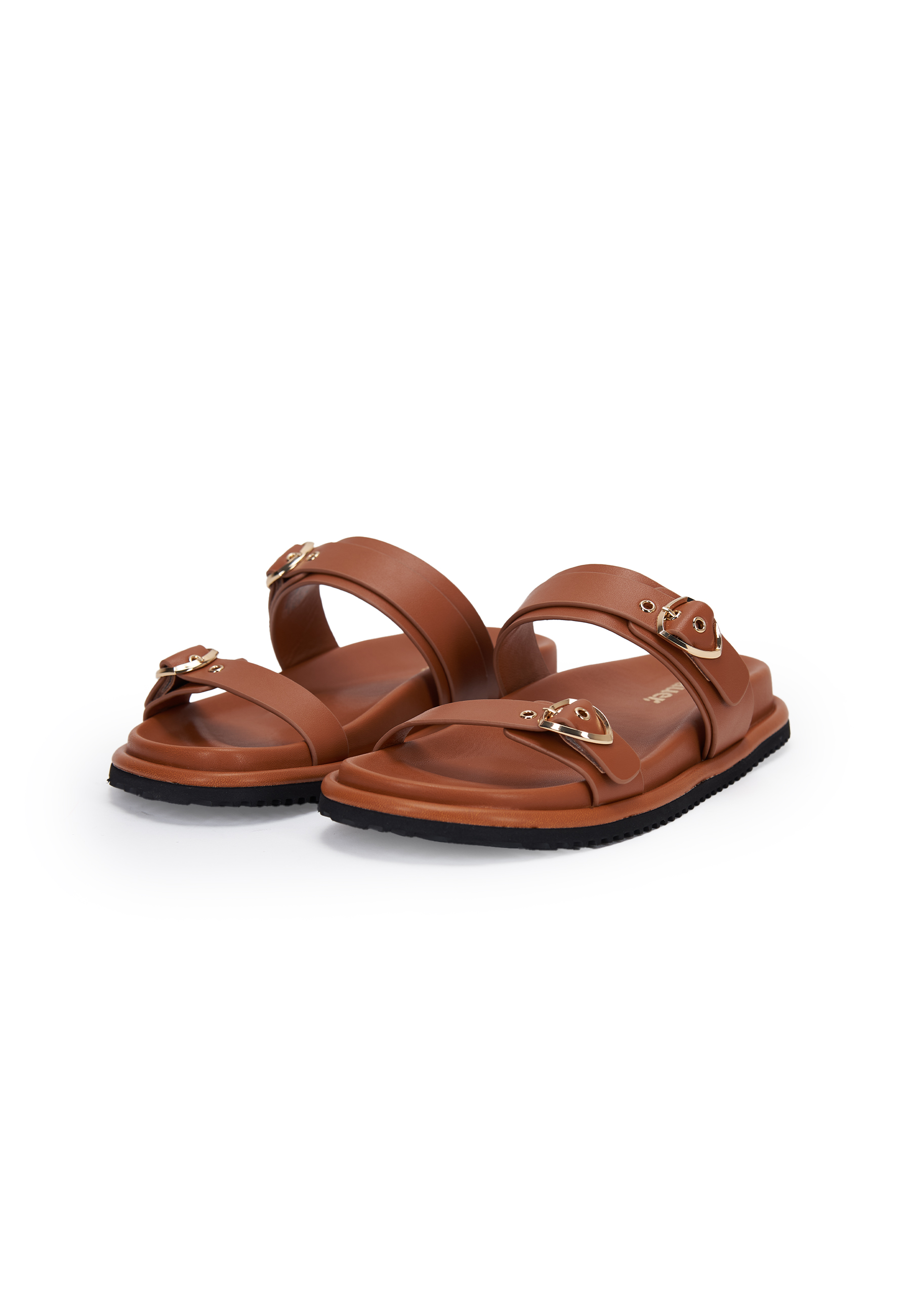 Evoluzione sofisticata del classico slide, questo sandalo punta sulla pulizia delle linee. Si distingue per le fibbie dorate a punta dal design unico e una silhouette essenziale. La suola sagomata garantisce comfort prolungato, rendendolo il compagno ideale per look estivi minimalisti ma ricercati.