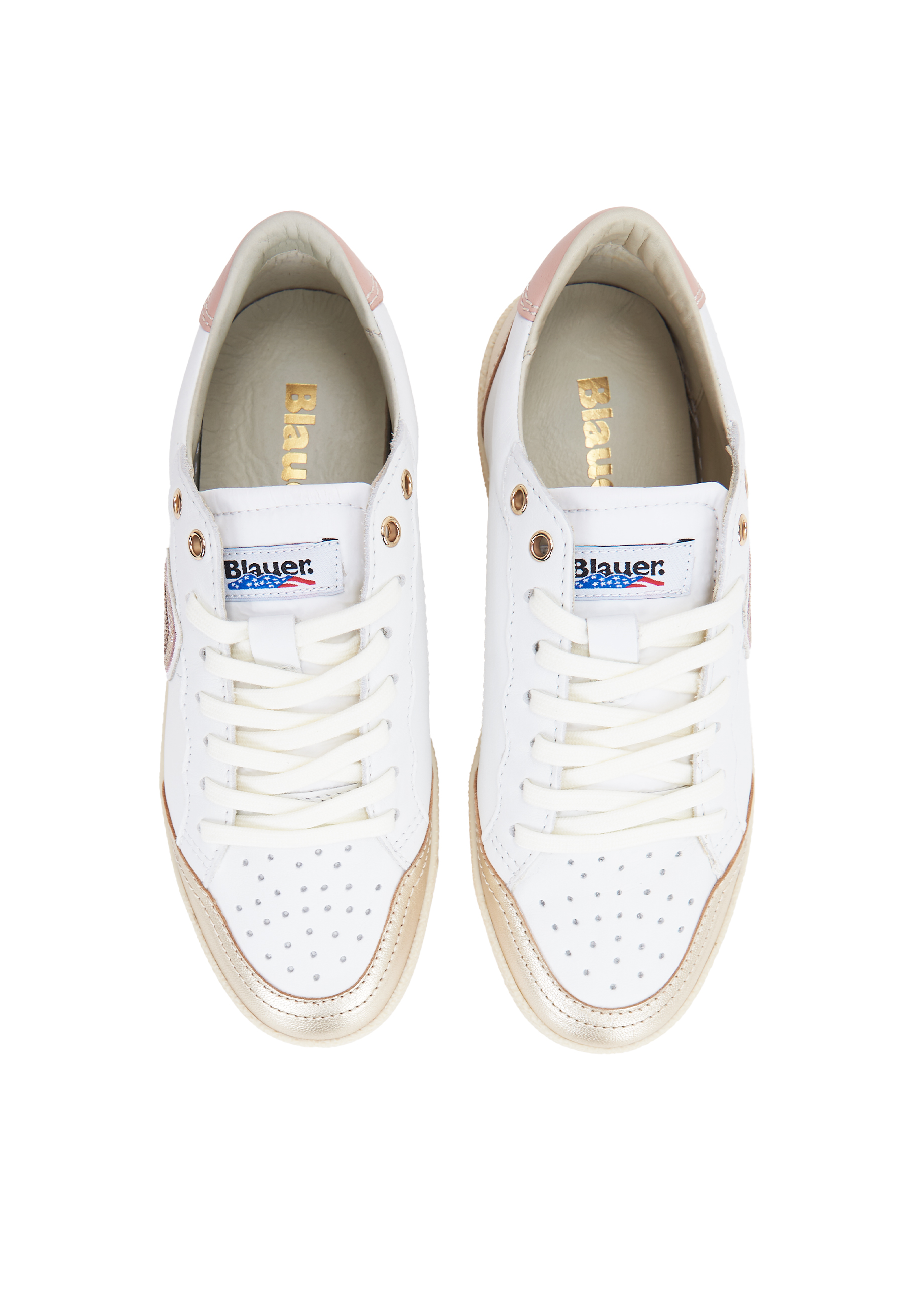 La sneaker Olympia risplende in questa versione chic con dettagli platino e rosa nude. Realizzata in pelle bianca con punta traforata, si distingue per gli inserti metallizzati sulla parte anteriore e il tallone rosa delicato. L'iconico scudetto Blauer in strass e i profili dorati elevano il design sportivo, rendendola l'accessorio ideale per chi ama un look casual prezioso e sempre luminoso.