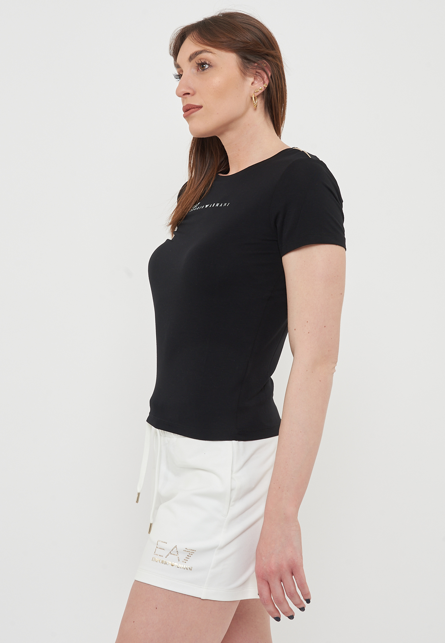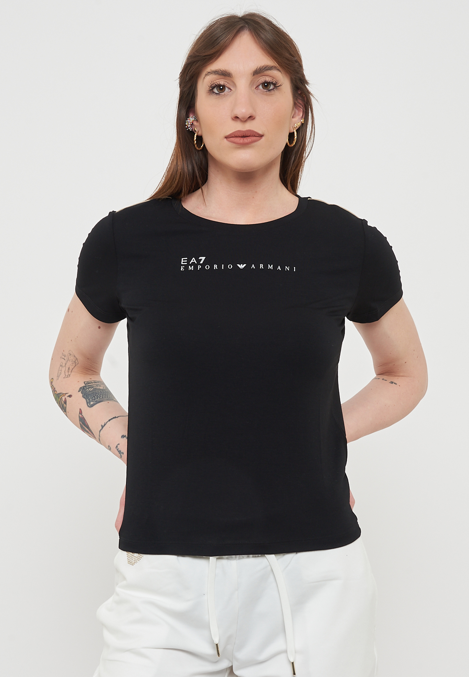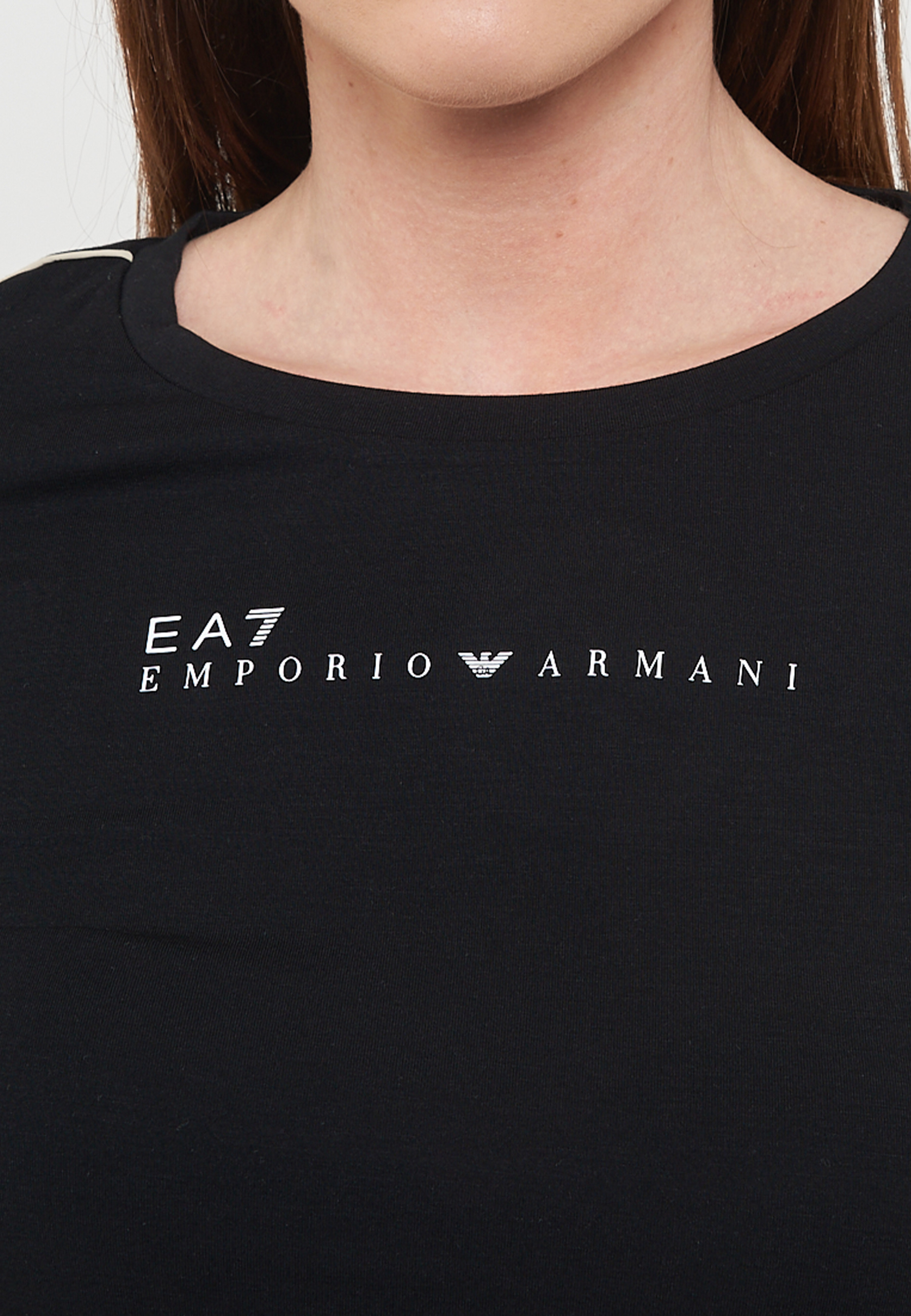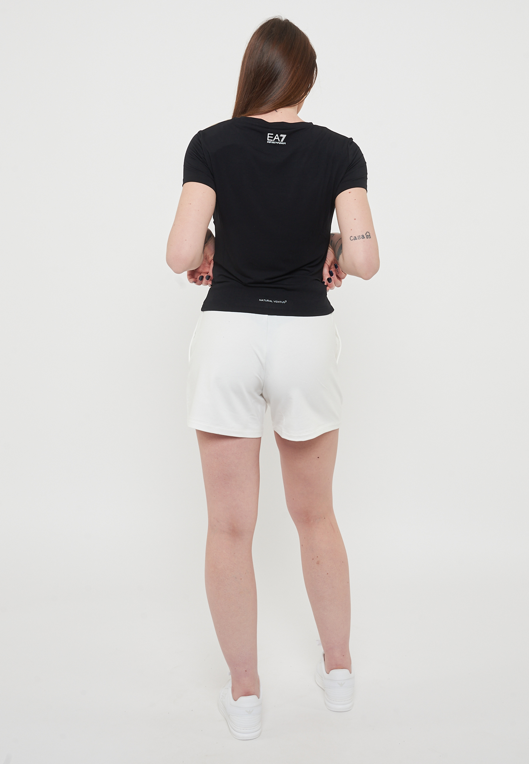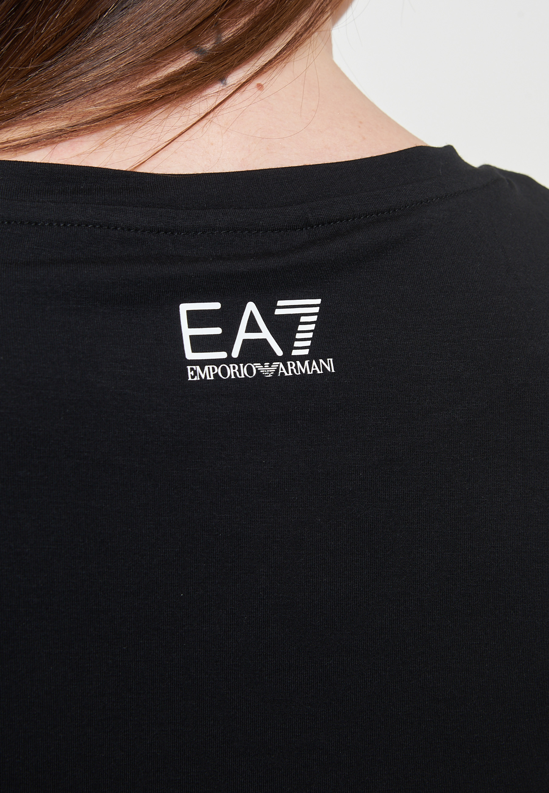 T-shirt girocollo dedicata agli sportivi, declinata nei colori di collezione e resa riconoscibile dal logo EA7 Emporio Armani stampato sul petto. Il capo è realizzato nell'innovativo tessuto tecnico Natural VENTUS7, composto da un mix di fibre naturali e sintetiche che permette di regolare la temperatura corporea espellendo il sudore come vapore acqueo, lasciando al tempo stesso una sensazione di comfort e morbidezza sulla pelle, grazie alla presenza delle fibre di cotone.