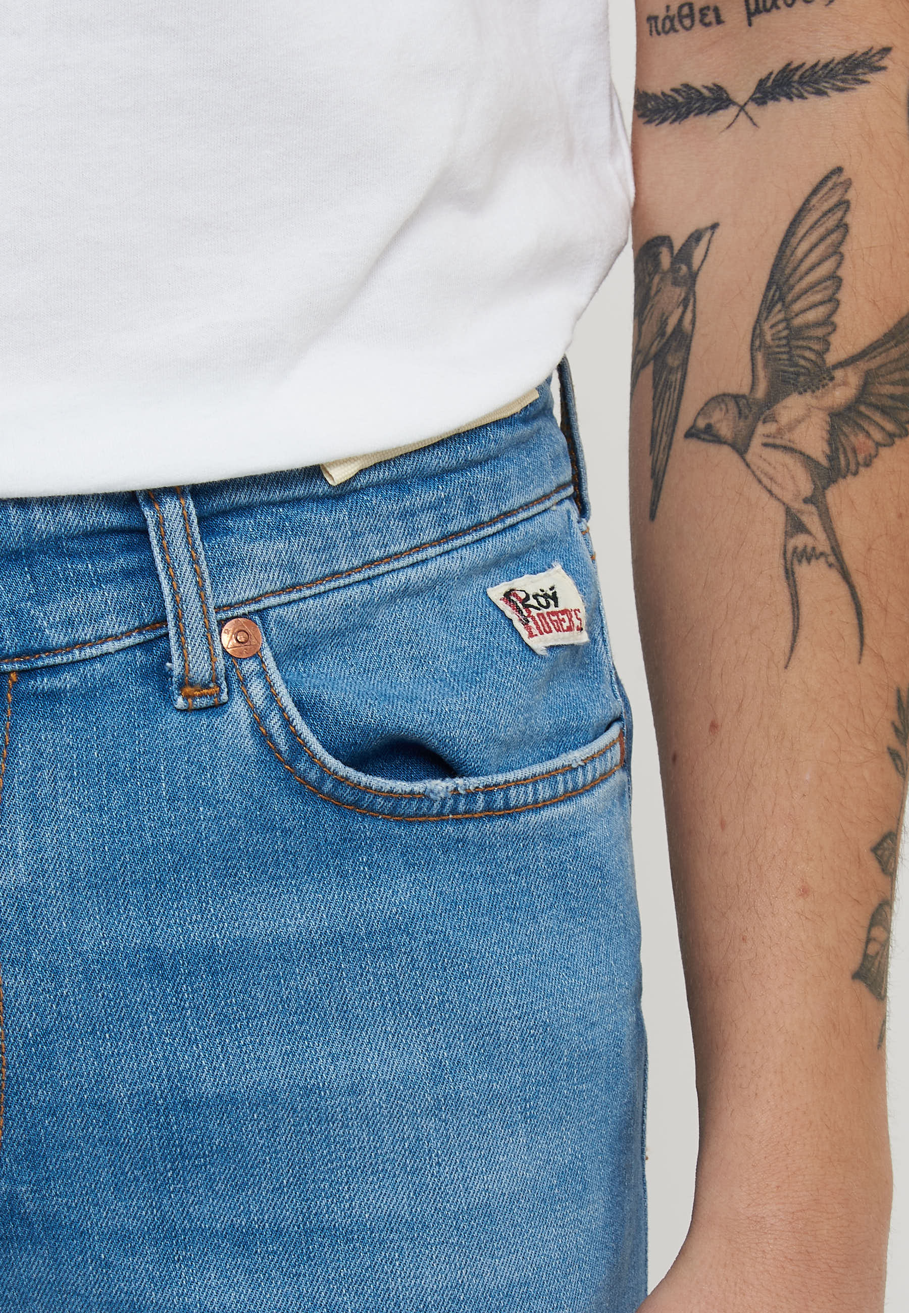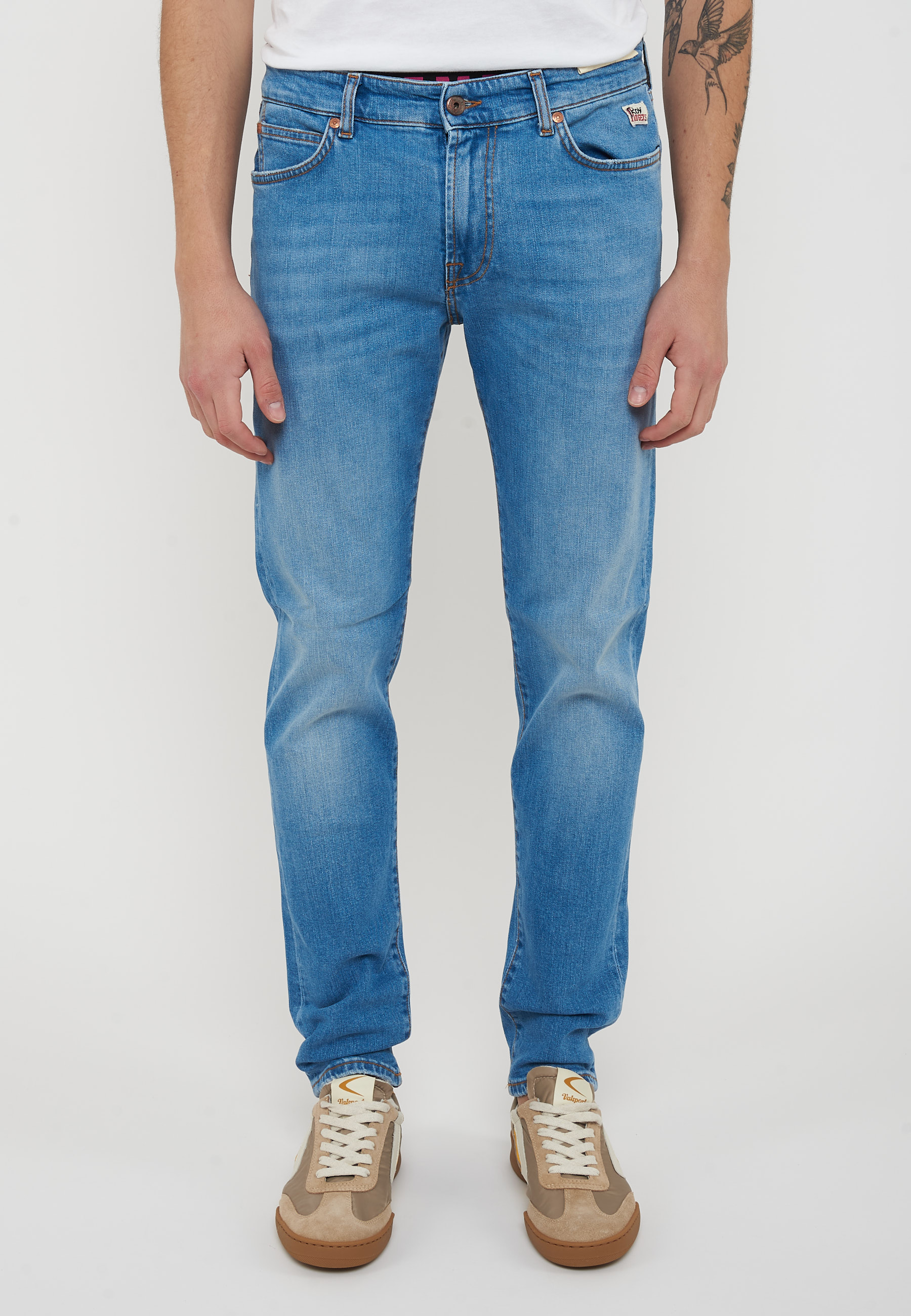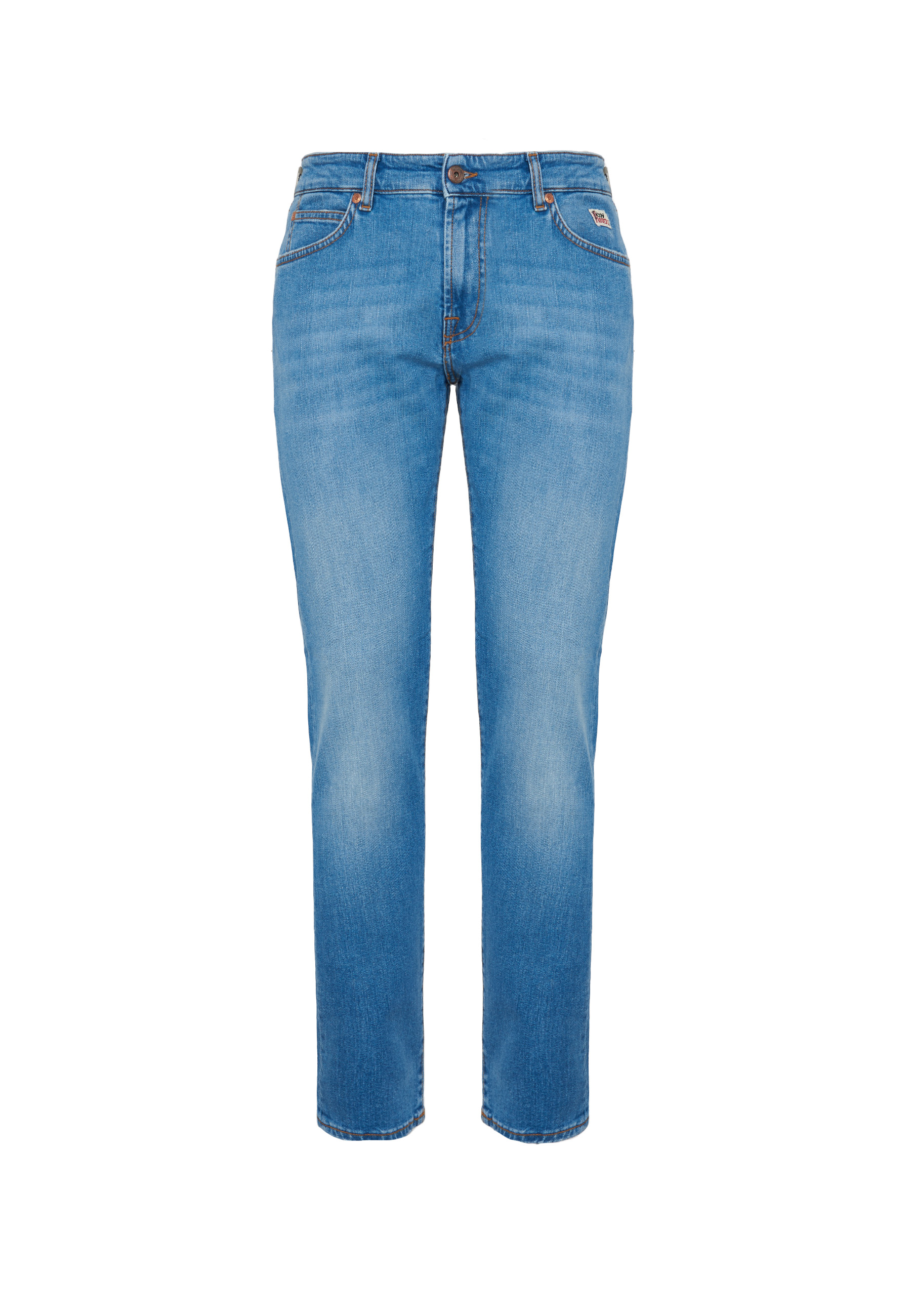 Jeans in denim con lavaggio chairo. Vita media con passanti e salpa applicata sul retro. Chiusura sul fronte con bottone logato e zip.Due tasche sul fronte e due tasche sul retro con label Roy Roger's applicato. Slim fit