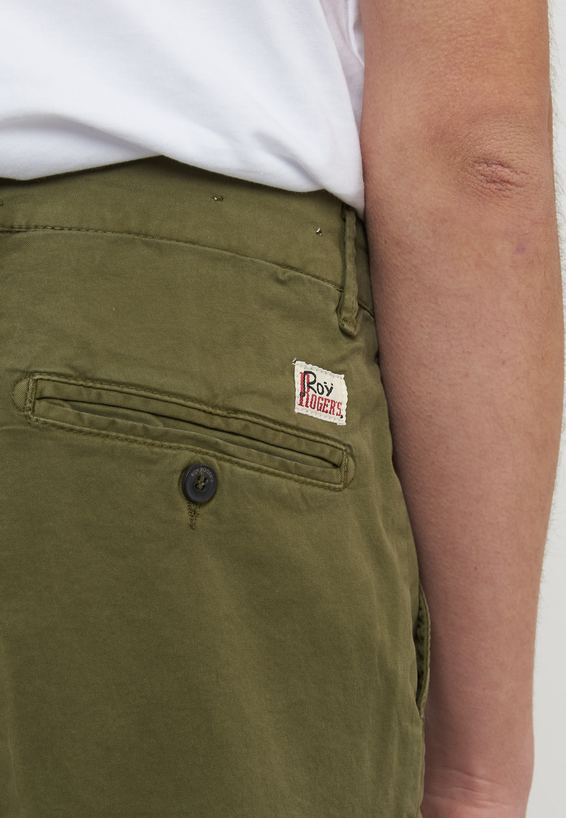 Due tasche all'americana sul fronte e due tasche a filetto sul retro con bottone logato.
