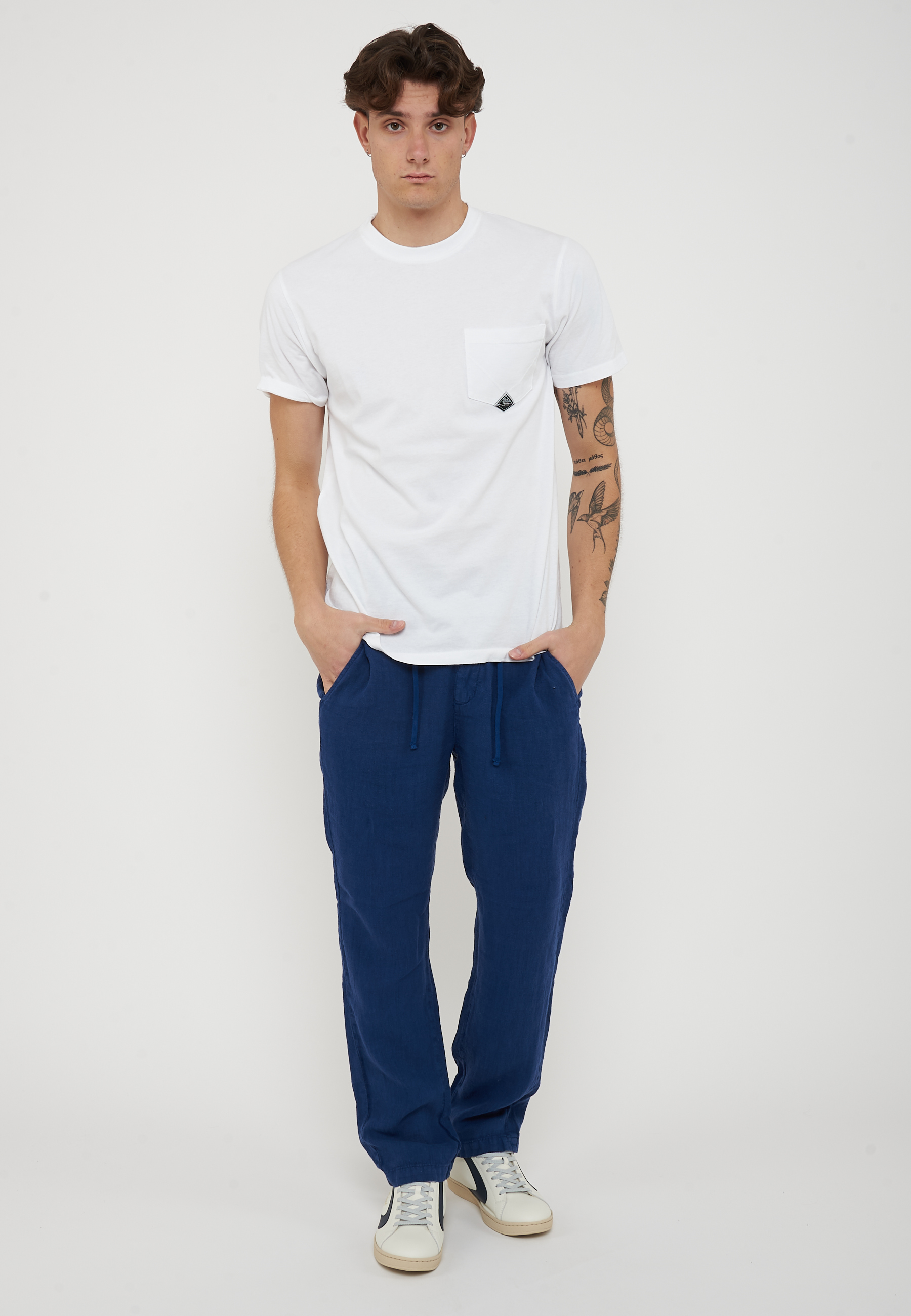 Tasche all'americana sul fronte e tasche a filetto sul retro con bottone.
