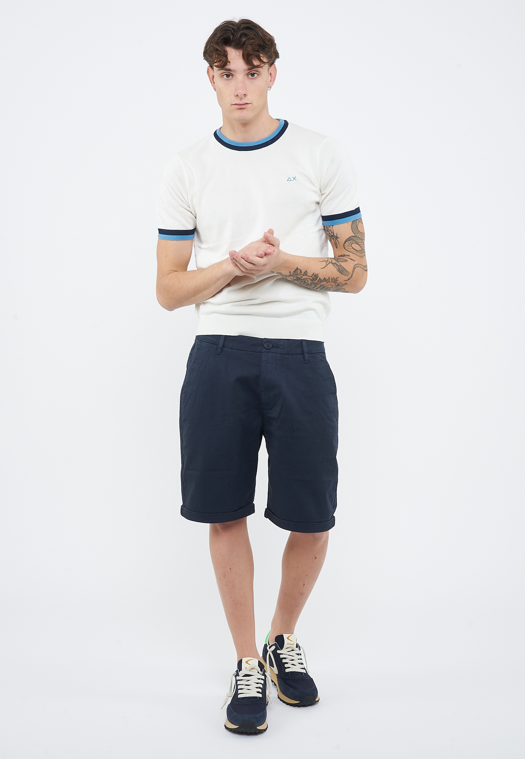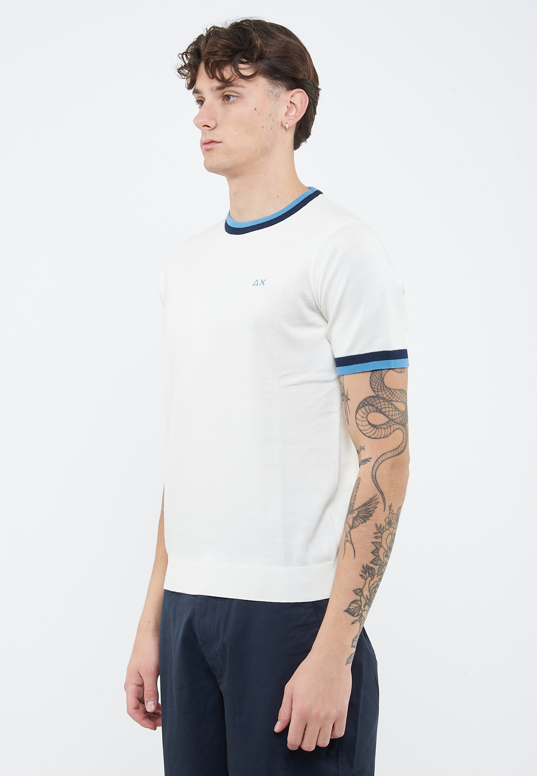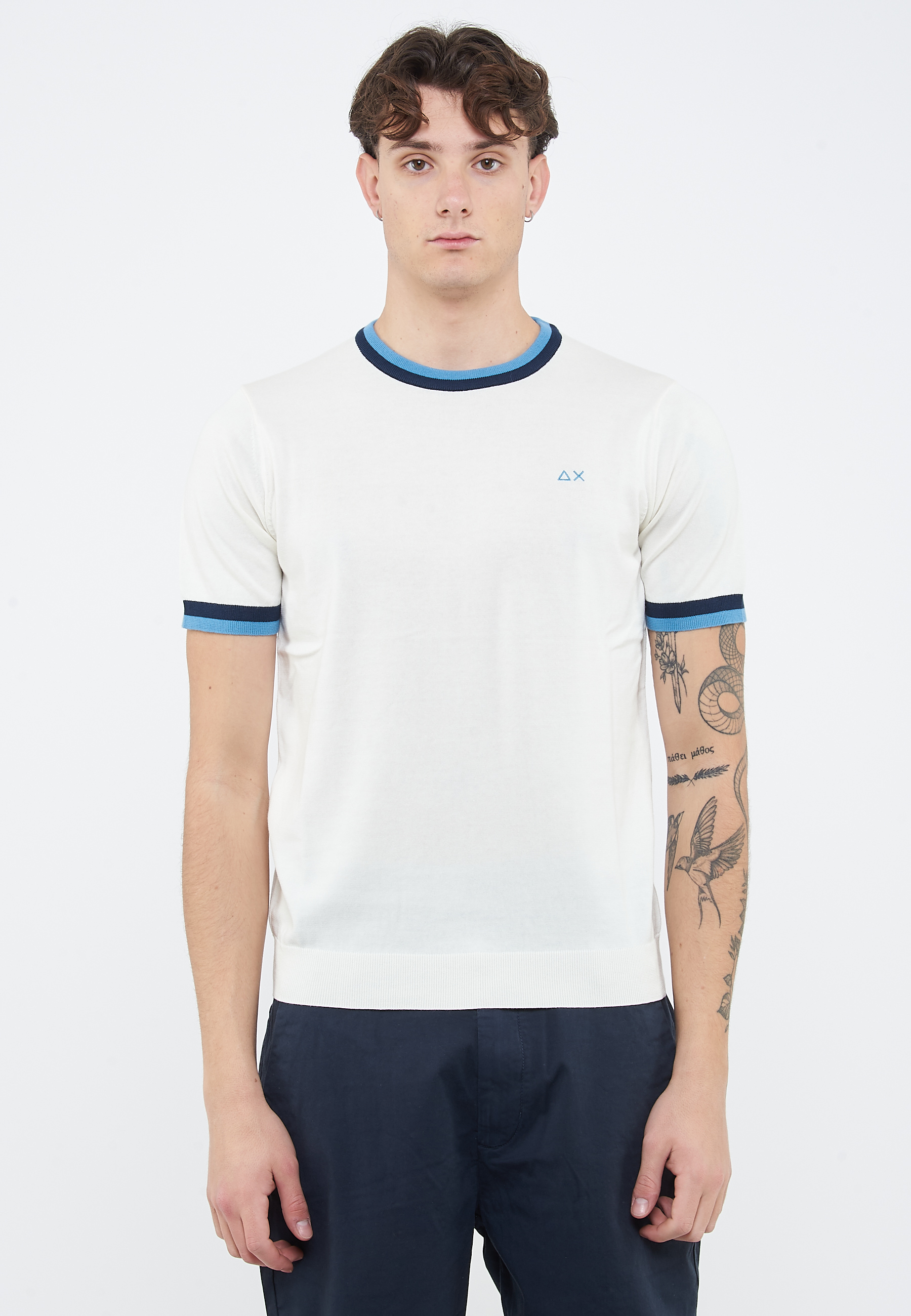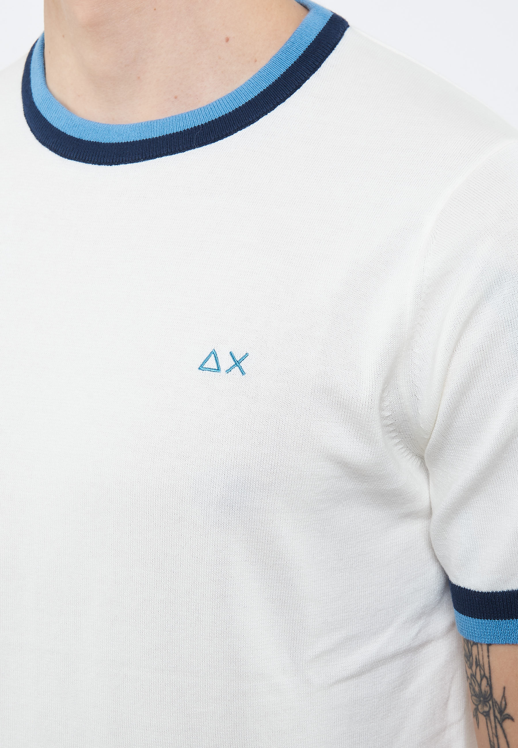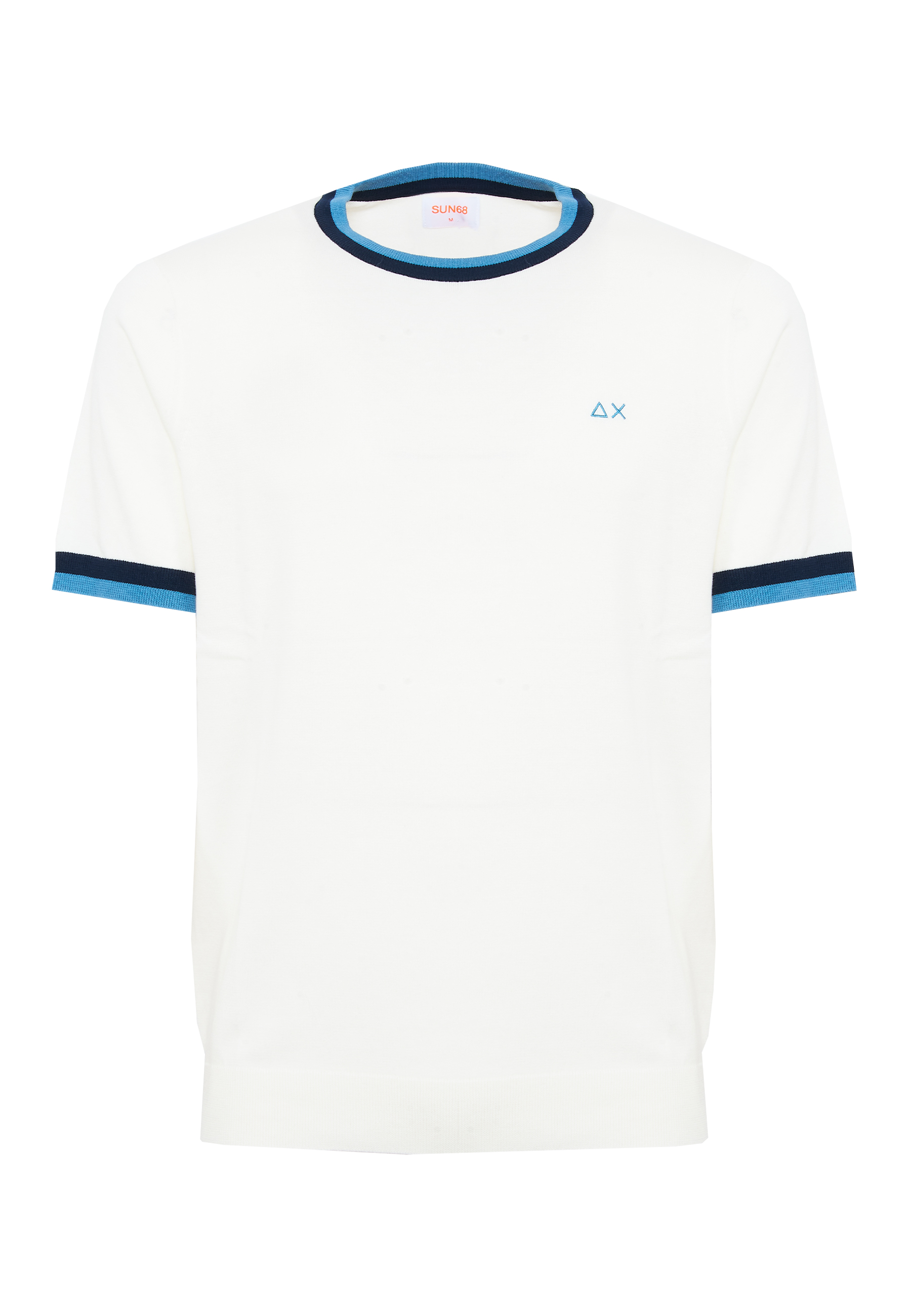 T-shirt in maglia di cotoneGirocollo con righe a contrastoManiche corte con righe a contrastoBordi a costineLogo SUN68 ricamato sul petto